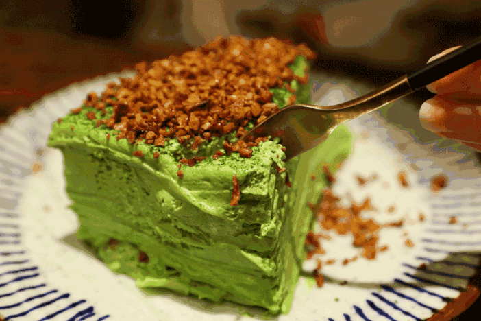 采用宇治京都茶赏会授赏抹茶,最大程度遵循京都老茶铺的古法工艺,将抹茶的清新和微苦融入甜品。18层薄且均匀的抹茶饼皮蓬松柔软,入口松软轻盈而不乏层次,茶味馥郁,奶香悠长。之所以成为必点爆款,据说很多人喜欢它浓郁的茶味配一层撒满的酥香核桃碎。