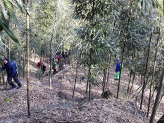 西关右边小径,向上穿行,左右均是细竹,很稀疏,二十来分钟,上行至公路,右拐。