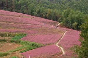 10:30 到达徒步起点,简单热身后,进入月宫山古道,沿溪而上,四周群山叠翠,竹林茂盛,溪水潺潺。途中经过一大片梦幻般的粉黛花海,如烟如纱一般,盛开在高山古村的山坡顶。