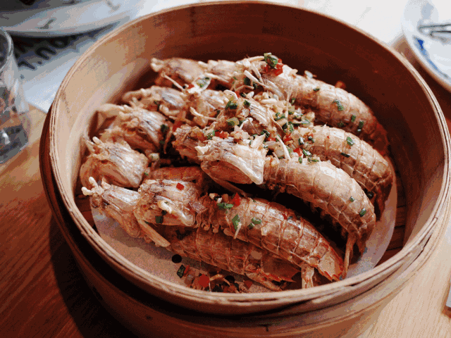 清蒸皮皮虾里加了葱姜酒,吃起来隐隐有黄酒的香味,衬的虾肉越发的甜。厨师长溜达过来问我们口味如何,顺便炫个小技:上锅蒸之前先把皮皮虾入开水烫一下,这样可以定型,摆盘更好看。