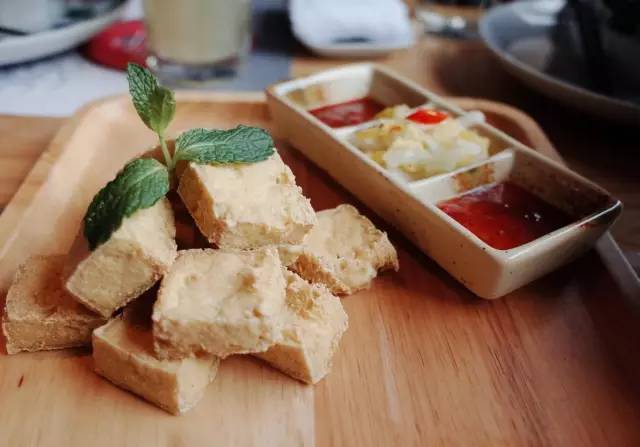 最后,插播两款征服我的点心——无心点的绍兴臭豆腐征服了整桌人,表皮炸的香脆,咬下去“嗤”的一声轻响,内里乳白软糯,搭配泡菜和辣酱能够化解油腻,难怪湾湾都爱这么吃。